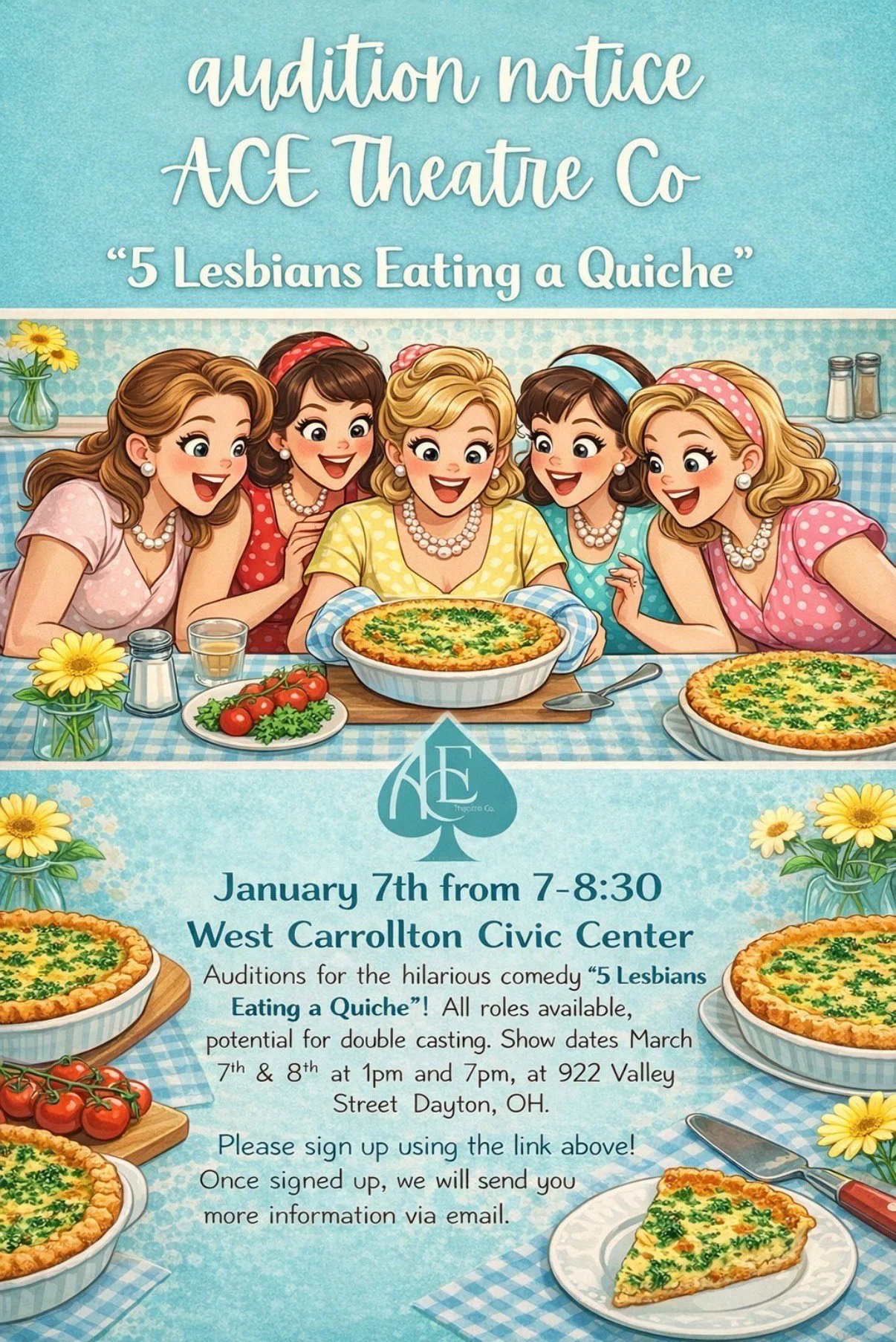 This crowd-favorite comedy will be produced as a fundraiser for Ace, and we’re looking for performers ready to lean into humor, heart, and a little bit of chaos. Think sisterhood, secrets, and… quiche.